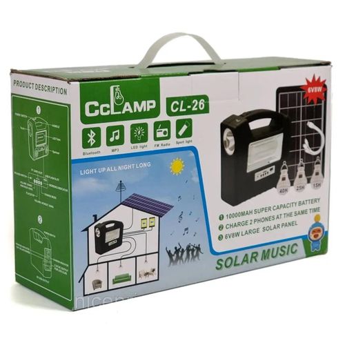 The new model of the popular brand CcLamp CL-26 with an elegant design comes with FM radio, MP3 player, Bluetooth speaker, three lamps, a set of adapters and a solar panel. Full charge time from the sun is 10-15 hours, DC output 3.2V for lighting in case of power failure.